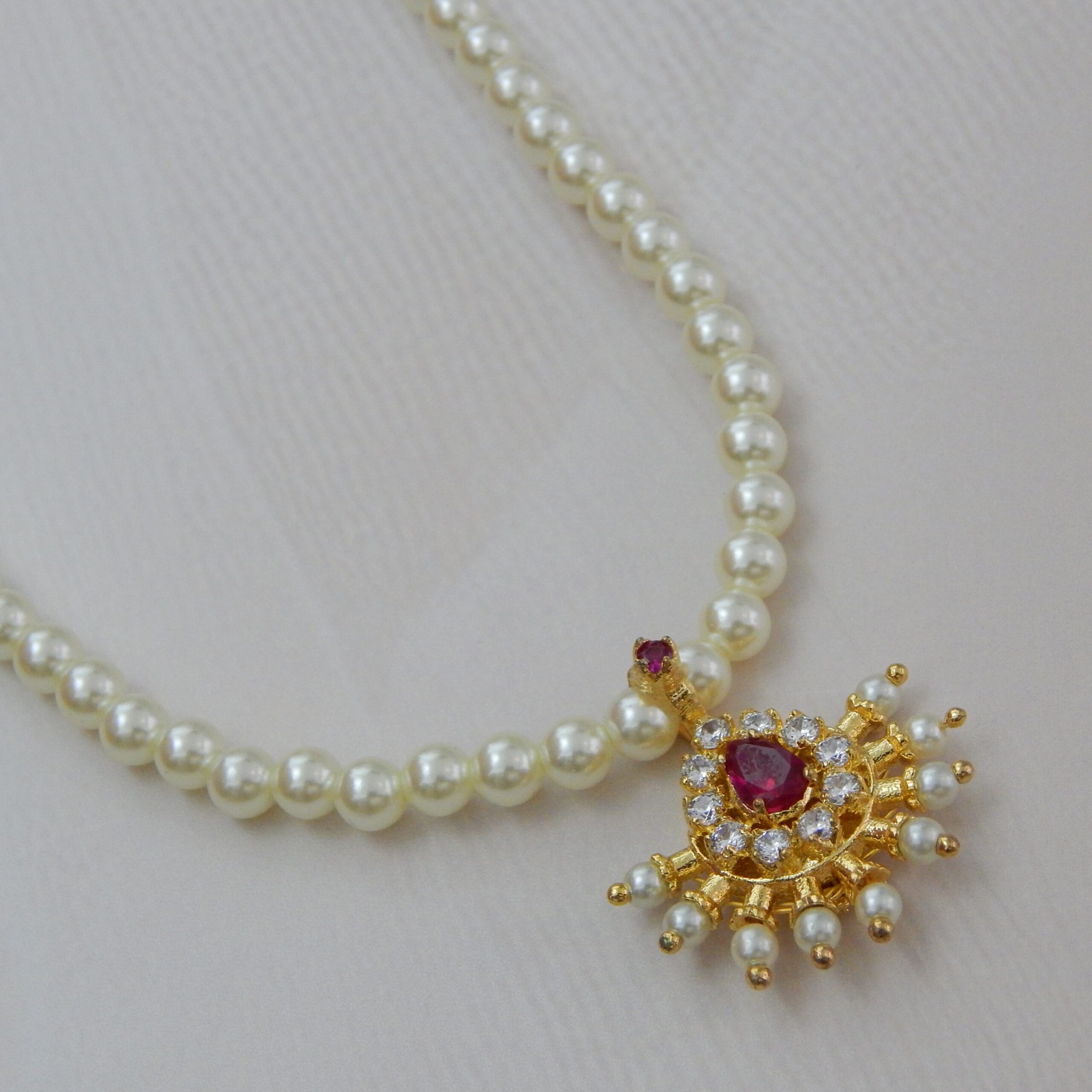 Celebrate traditional artistry with this Sunburst-Inspired Pearl Necklace from Royal Reflection DS. The radiant design features glossy faux pearls and a bold gold-toned pendant adorned with a ruby-colored centerpiece surrounded by white stones and delicate pearl droplets. Ideal for festive occasions, wedding wear, or elegant gifting, this necklace elevates any ethnic ensemble with ease.